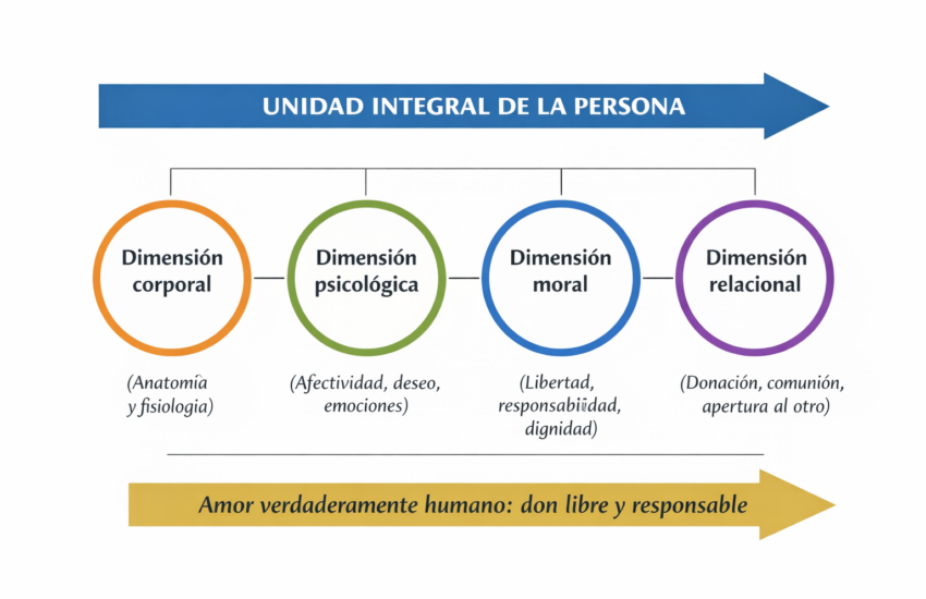 En este sentido, el Catecismo de la Iglesia católica (n. 2332) señala: “La sexualidad abraza todos los aspectos de la persona humana, en la unidad de su cuerpo y de su alma. Concierne particularmente a la afectividad, a la capacidad de amar y de procrear y, de manera más general, a la aptitud para establecer vínculos de comunión con otro.” Añade (n. 2333) que “la diferencia y la complementariedad físicas, morales y espirituales, están orientadas a los bienes del matrimonio y al desarrollo de la vida familiar. La armonía de la pareja humana y de la sociedad depende en parte de la manera en que son vividas entre los sexos la complementariedad, la necesidad y el apoyo mutuos.”